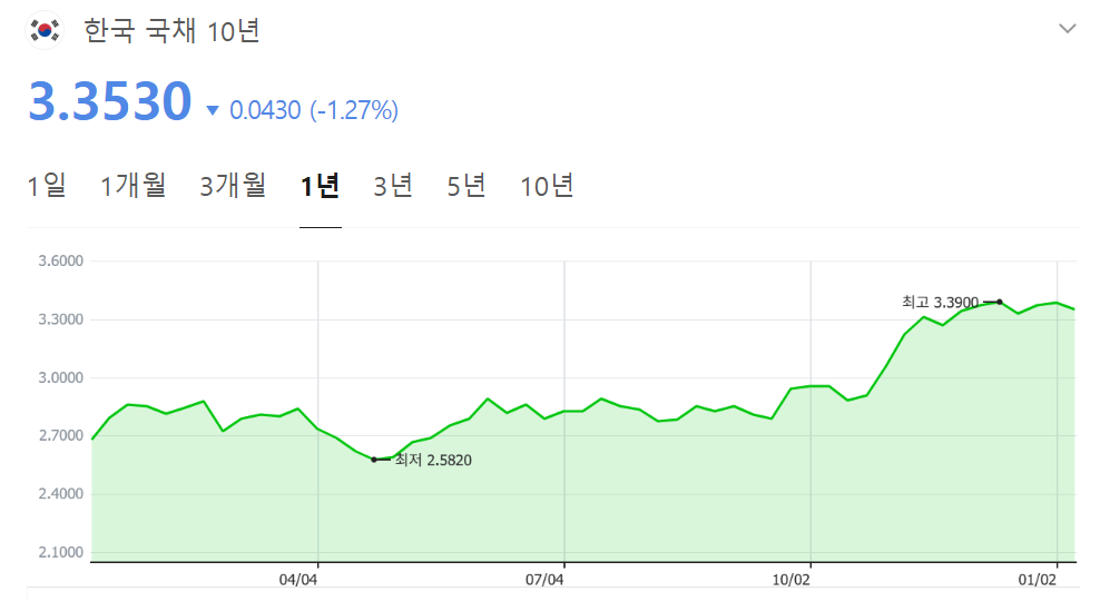 한국 국채 2년 /10년 수익률