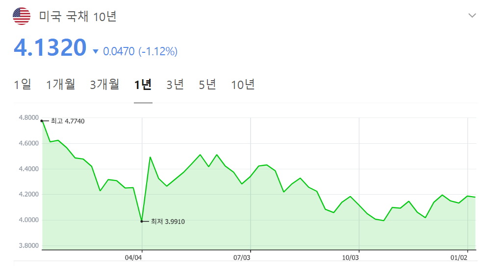 2026년 1월 현재 미국 10년물 국채 수익률은 약 4.175%, 2년물은 3.46%, 30년물은 4.86% 수준으로 확인됩니다. 단기 금리보다 장기 금리가 높은 구조가 나타나며, 이는 시장이 금리 인하보다 ‘장기 인플레이션 지속’을 반영하고 있음을 의미합니다. 이러한 흐름은 채권 수익률에 직접적인 영향을 줍니다.